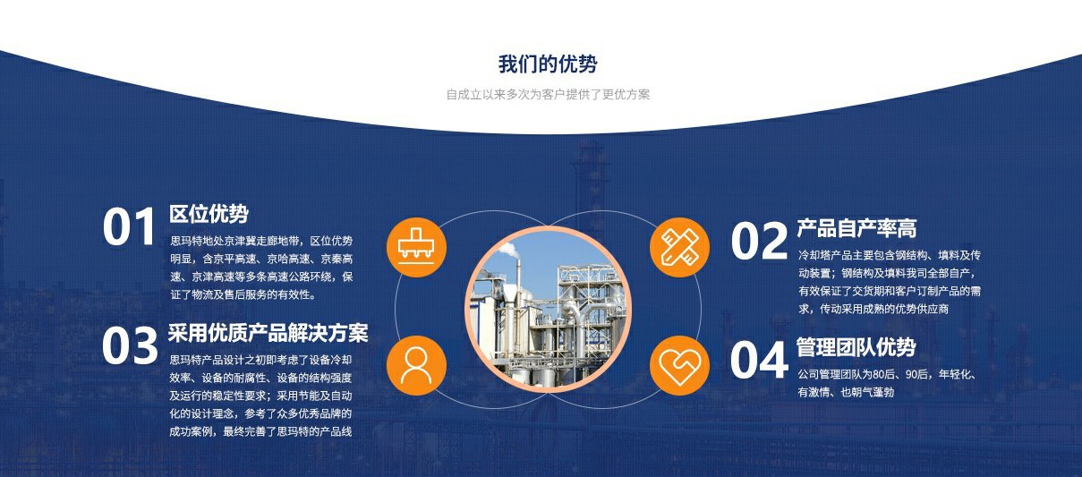 思瑪特(北京)制冷設備有限公司 是一家專業從事冷卻塔及附屬配件的生產制造企業,自公司成立以來,承接了多個工業冷卻塔配套項目及制冷系統末端冷卻塔設備的配套項目,也承接了多個冷卻塔節能改造項目的落地實施,獲得了客戶的一致好評。